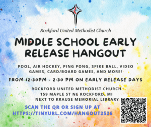 Parents, guardians and grandparents, are you looking for a safe place for your teen(s) to go to on Early Release Days?  Then look no further, Rockford UMC is offering the Early Release Hangout for students in grades 6-8.  Students who attend can play games, including pool, ping pong, air hockey and more, hang out with others and enjoy snacks.